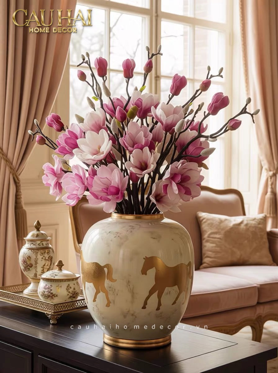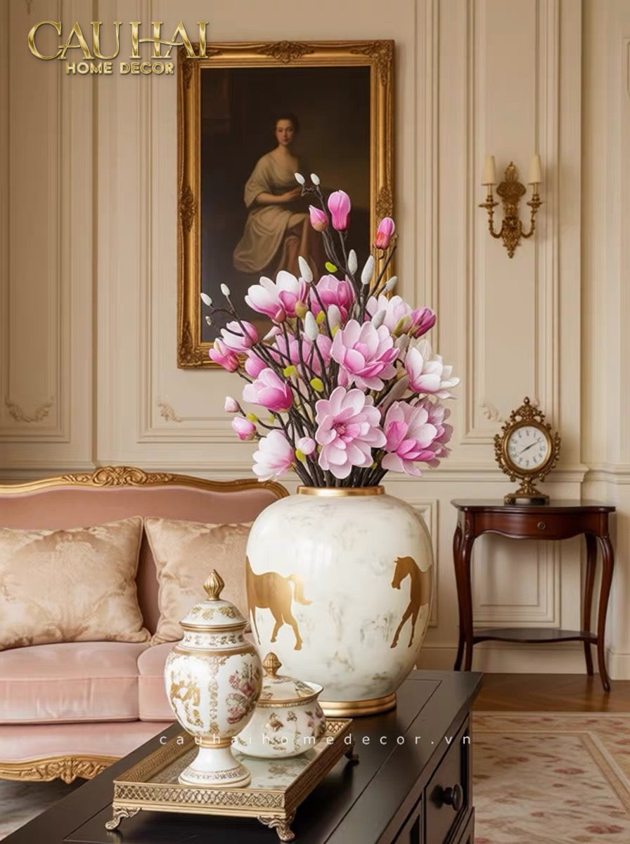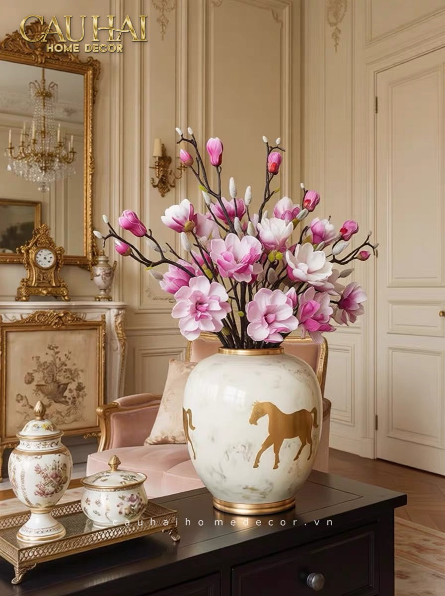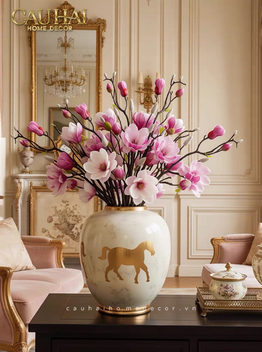 Cheval Noble Ivoire không chỉ là một chiếc bình hoa – đây là một tác phẩm điêu khắc gốm sứ mang biểu tượng của sức mạnh, tự do và thịnh vượng. Hình ảnh chú ngựa cao quý (Cheval Noble) từ lâu đã là biểu tượng của quyền lực, phẩm giá và khát vọng vươn xa trong nhiều nền văn hóa trên thế giới.