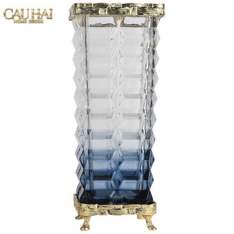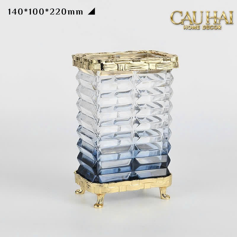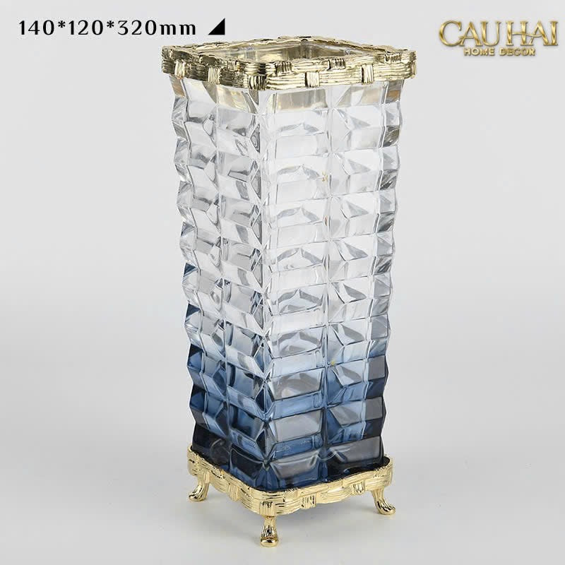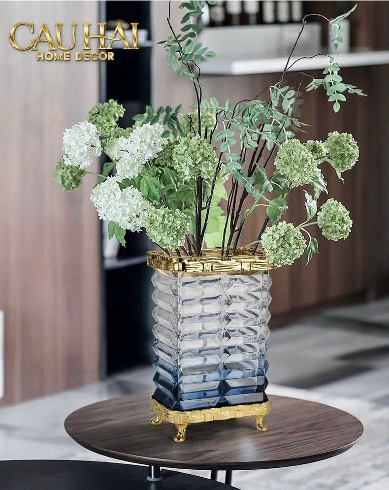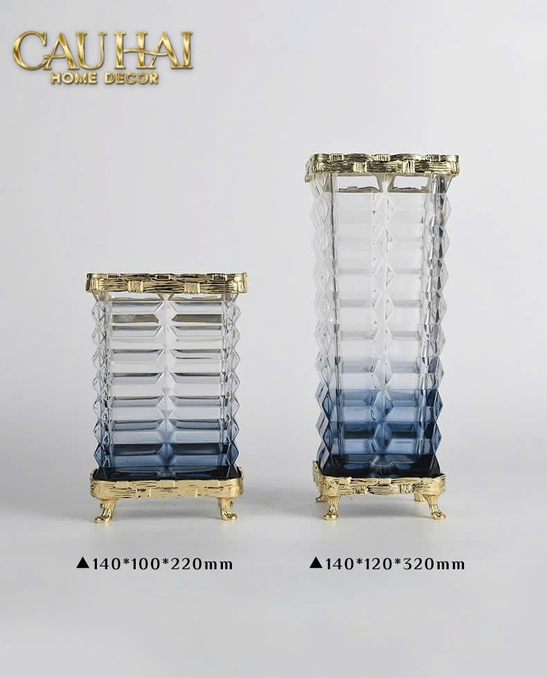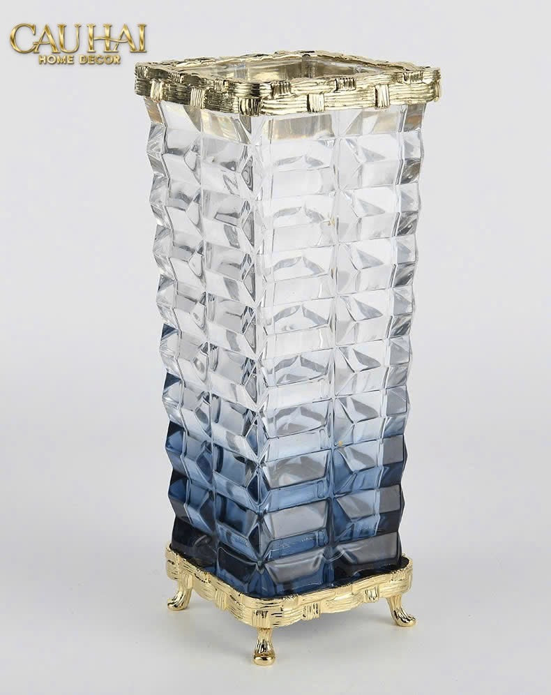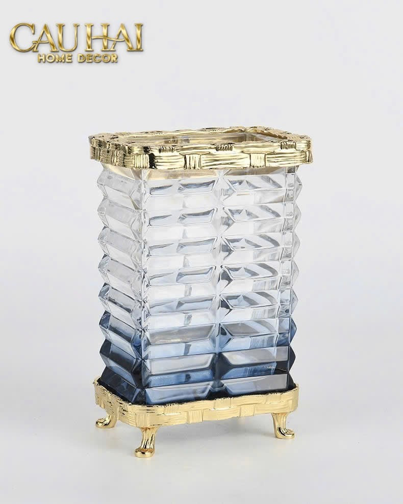 Phần đế kim loại mạ vàng ánh champagne được điêu khắc thủ công, mô phỏng chân trụ cổ điển, nâng đỡ toàn bộ khối pha lê như một tác phẩm nghệ thuật gallery. Sự kết hợp giữa sắc xanh Azure và ánh kim vàng mang lại cảm giác vừa hiện đại, vừa giàu dấu ấn cổ điển – phong cách đặc trưng của Home Couture tại Cậu Hai.