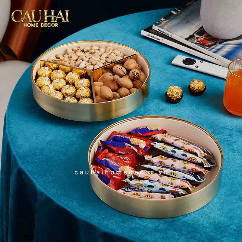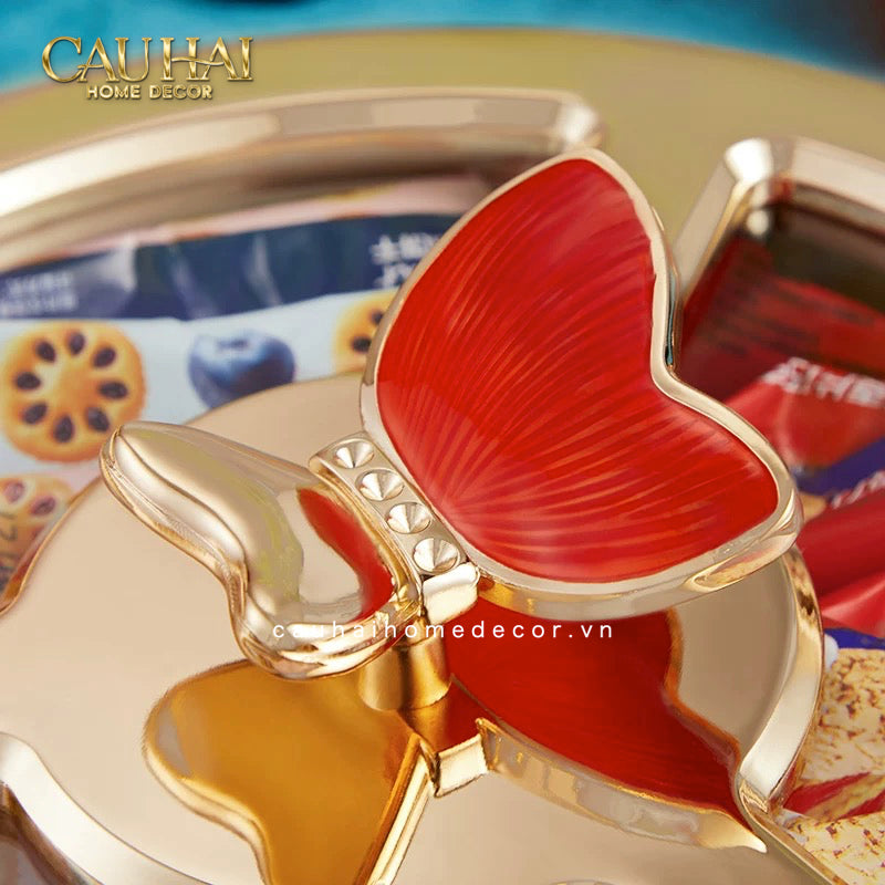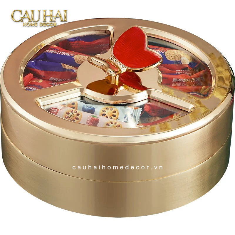 Chất liệu & Màu sắc: Vỏ ngoài bằng nhựa cao cấp phủ lớp sơn vàng ánh kim sang trọng, trang trí họa tiết bướm (Papillon) hoàng gia tinh xảo với chi tiết đính đá lấp lánh. Bên trong là các khay nhựa trong suốt chất lượng cao, giúp bảo quản và trưng bày bánh mứt một cách hoàn hảo. Thiết kế xoay 2 tầng với cơ chế mở đóng tiện lợi, tay cầm hình vương miện tạo điểm nhấn đẳng cấp.