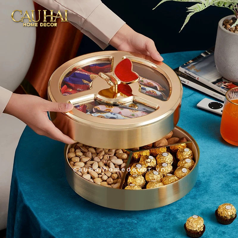 Ứng dụng - Công năng: Hộp đựng bánh mứt cao cấp dành cho mâm Tết, thiết kế 2 tầng xoay giúp tối ưu không gian và dễ dàng lấy bánh mứt. Phù hợp để trưng bày các loại bánh kẹo, mứt Tết, hạt dinh dưỡng một cách sang trọng và tiện lợi. Họa tiết bướm hoàng gia mang ý nghĩa may mắn, thịnh vượng và sự chuyển mình tốt đẹp trong năm mới. Là món quà tặng đẳng cấp cho dịp Tết Nguyên Đán, thể hiện sự tinh tế và phong cách của gia chủ. Có thể sử dụng quanh năm để đựng đồ ăn nhẹ, trái cây sấy khô hoặc làm hộp trang sức.