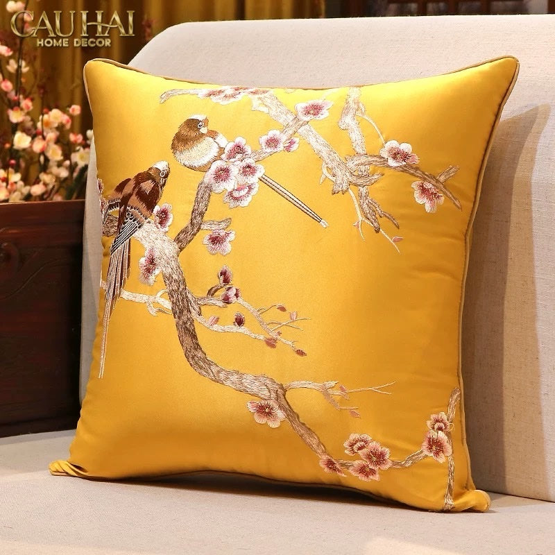 Tết Couture - Vỏ Gối Lụa Thêu Hỷ Mai Viên 45