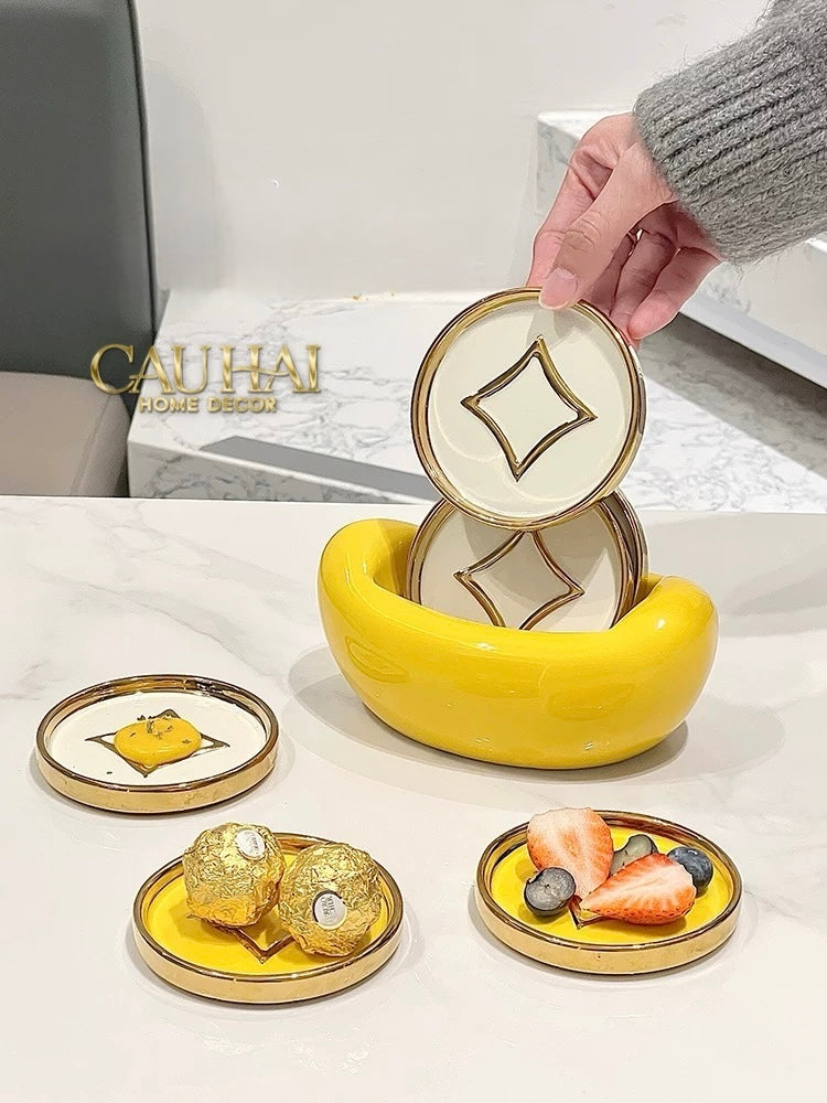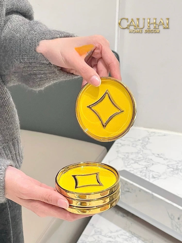 Tết Couture - Set 4 Lót Ly Sứ Đồng Tiền Tài Lộc Golden Coin Ceramic Glasses Coaster